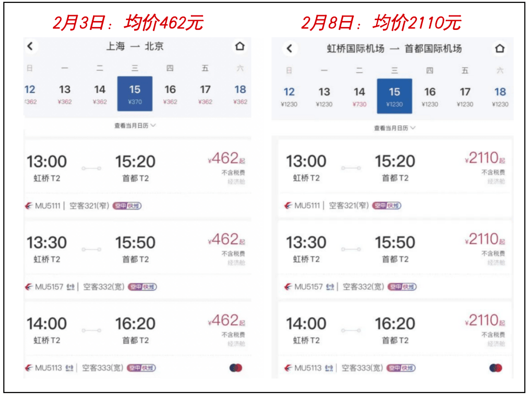 出行的票價(jià)也在上漲。同樣的地點(diǎn)、同樣的時(shí)間段,2月3日價(jià)格還不到500元,短短5天內(nèi),機(jī)票價(jià)格就普遍超過了2000元。