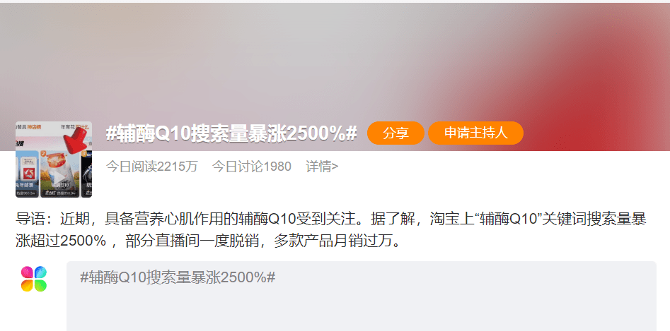 電商平臺(tái)上搜索“輔酶Q10”的關(guān)鍵詞量上漲了2500%,有的直播間出現(xiàn)斷貨現(xiàn)象,一些產(chǎn)品的月銷量達(dá)到了一萬件以上。許多線上線下渠道都已賣斷貨,有多名網(wǎng)友還爆料個(gè)別產(chǎn)品短期內(nèi)價(jià)格漲幅明顯,“一天一提價(jià)”引發(fā)廣泛熱議。