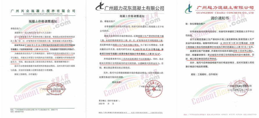 同期多地砂石骨料、粉渣微粉、商砼企業(yè)也通知上調(diào)報(bào)價(jià)。其中廣東部分商砼企業(yè)一次性上調(diào)50元/噸。