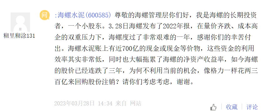 另有一位海螺的長期投資者表示:海螺水泥2022年在量價齊跌、成本高企的雙重壓力下,海螺度過了非常艱難的一年,感謝你們的辛苦付出。海螺水泥賬上有近700億的現(xiàn)金或現(xiàn)金等價物,這些資金的利用效率其實非常低,同時也大幅拖累了海螺的凈資產(chǎn)收益率,如今海螺的股價已經(jīng)連跌了三年,為何不利用當(dāng)前的機會,像格力一樣花兩三百億來回購股份注銷?