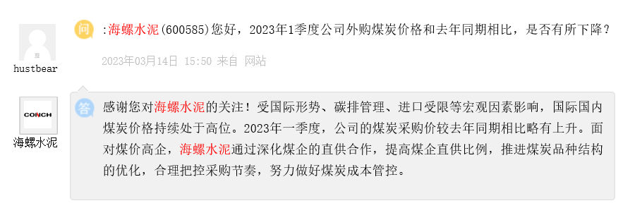 海螺水泥回復(fù)稱,2023年,公司將繼續(xù)深耕水泥主業(yè),抓實市場建設(shè),因時因勢差異施策,掌握市場競爭主動,穩(wěn)份額,降成本,增效益。