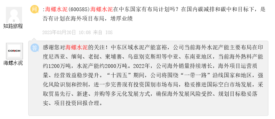 問題七:海螺水泥在中東國家有布局計劃嗎?在國內(nèi)碳減排和碳中和目標(biāo)下,是否有計劃在海外項目布局,增厚業(yè)績?