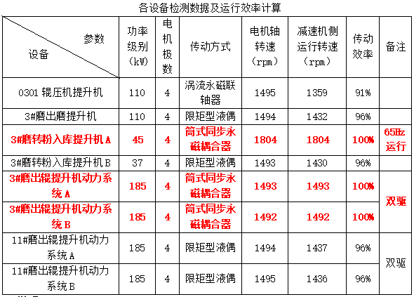 2、測量時間為水泥生產(chǎn)淡季,工況為間歇式運(yùn)行,載荷較低,甚至部分工況部分時間為空載運(yùn)行,實際載荷對液偶運(yùn)行轉(zhuǎn)速影響較明顯,故測得目前液偶輸出轉(zhuǎn)速均較高,滿料運(yùn)行后液偶輸出轉(zhuǎn)速將會有所降低,傳動效率將處于95%左右。