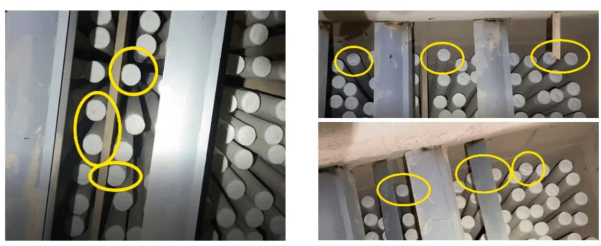 6 檢查除塵器灰斗煙氣入口處是否有堆灰現(xiàn)象。堆灰可導(dǎo)致截面積減小,氣流流速增大,系統(tǒng)壓差增大,并可能造成局部位置的濾袋沖刷磨損