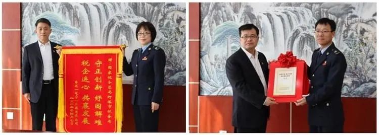 金隅冀東水泥遼寧區(qū)域黨委書記閆海峰向燈塔市稅務(wù)局贈送錦旗,燈塔市稅務(wù)局副局長張毅向臺泥(遼寧)水泥有限公司贈送稅收宣傳資料。