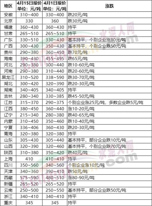 漲價發(fā)通知,跌價不通知。一片跌跌不休中,水泥價格越來越不透明,各企業(yè)對外報價核心市場、外埠市場、新開發(fā)市場各有不同。針對商砼客戶、經(jīng)銷商、建材店又有不同優(yōu)惠促銷政策,南方雨季到來,4月中下旬水泥價格大概率仍維持目前下行趨勢。