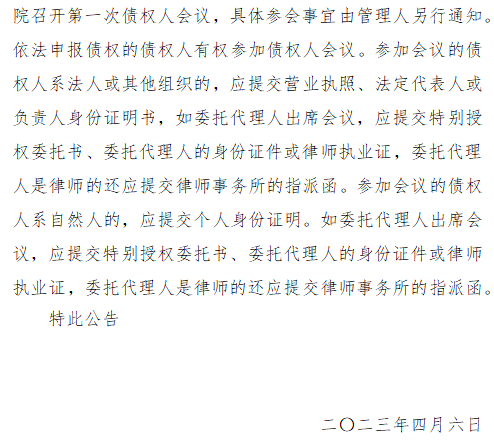 3月2日宏大興業(yè)水泥有限公司管理人發(fā)布職工債權(quán)公示稱,安吉縣人民法院于2022年12月12日裁定受理安吉宏大興業(yè)水泥有限公司破產(chǎn)清算,指定浙江六和(湖州)律師事務(wù)所擔(dān)任管理人。