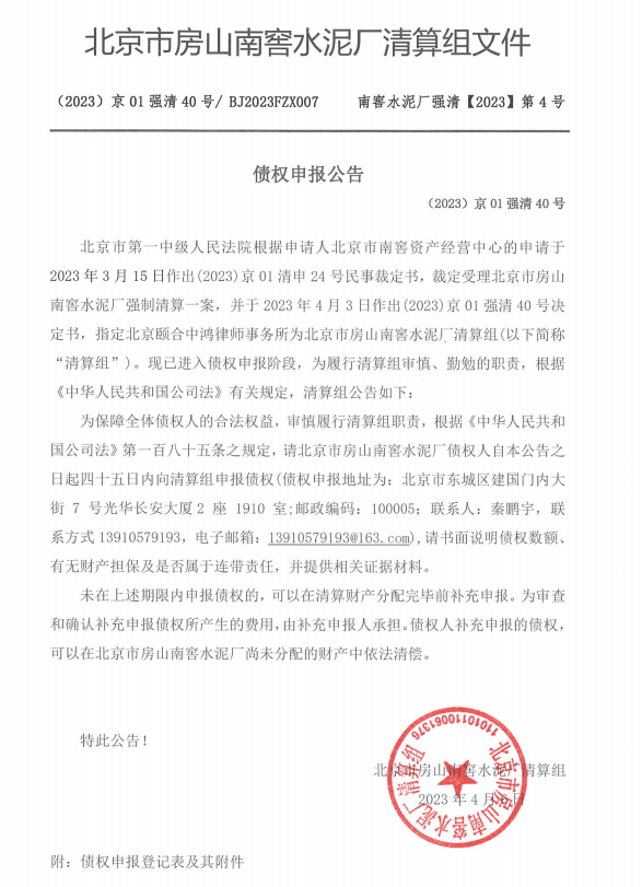 4月6日北京市房山南窖水泥廠清算組發(fā)布債權(quán)申報(bào)公告稱,北京市第一中級(jí)人民法院于2023年3月15日裁定受理北京市房山南窖水泥廠強(qiáng)制清算一案,并于 2023 年4月3日作出強(qiáng)清40 號(hào)決定書,指定北京頤合中鴻律師事務(wù)所為北京市房山南窖水泥廠清算組,現(xiàn)已進(jìn)入債權(quán)申報(bào)階段。