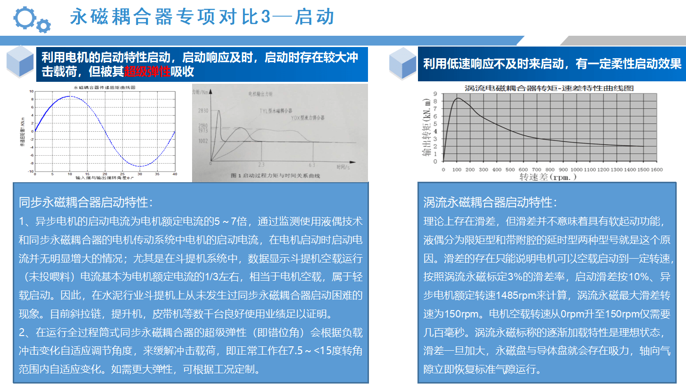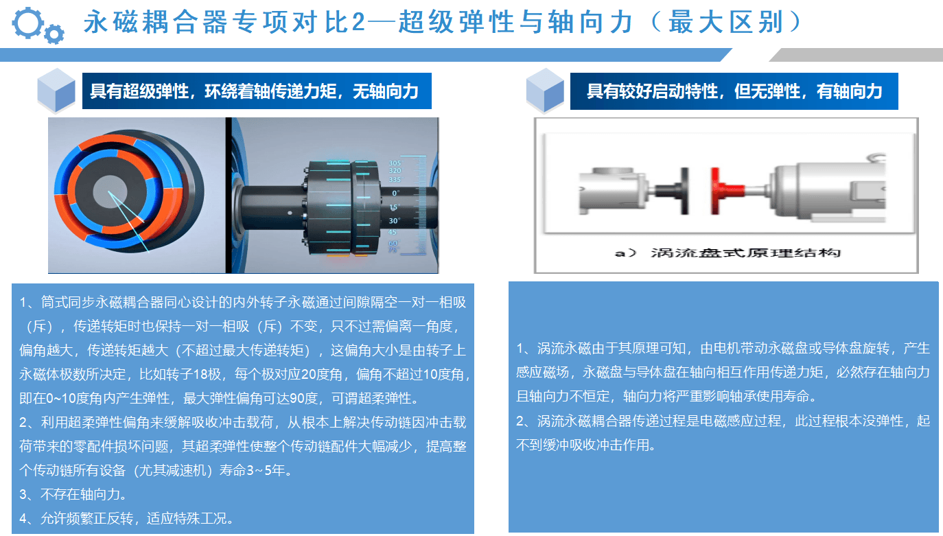 從以上的應(yīng)用案例來(lái)看,同步永磁耦合器的應(yīng)用效果會(huì)比較明顯,接下來(lái),我們通過(guò)數(shù)據(jù)對(duì)比的形式,具體分析筒式同步全永磁耦合器與渦流永磁耦合器優(yōu)劣勢(shì):