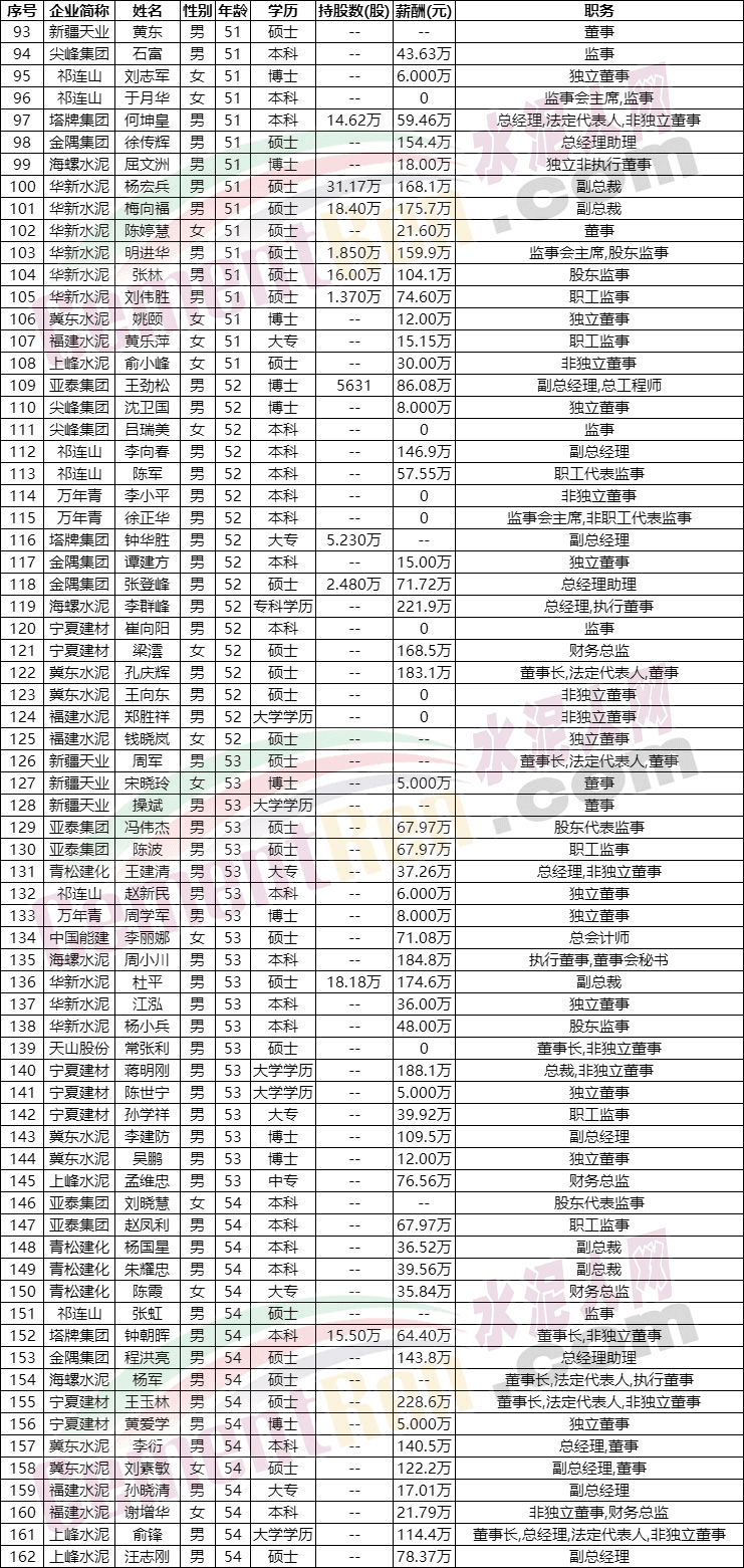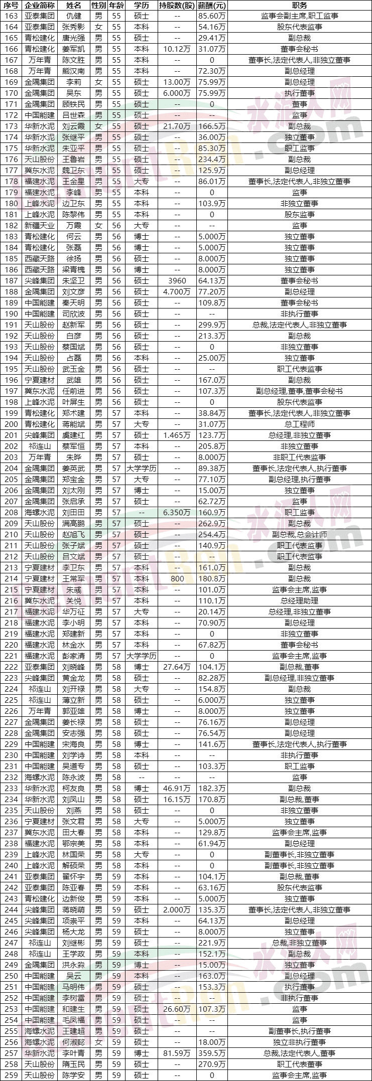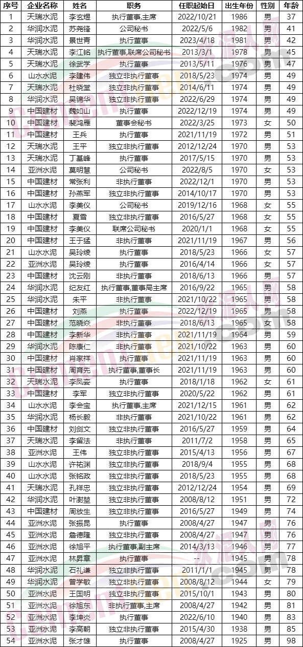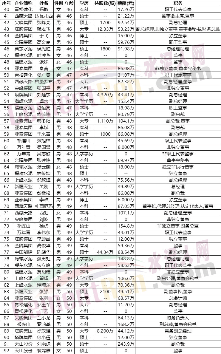 據(jù)水泥人網(wǎng)了解,部分水泥集團已明確年齡在58歲的高管退居二線,從上市公司公布的數(shù)據(jù)也可見出生于1970-1980年間的管理層為目前行業(yè)的主力,且多為本科及以上學歷。