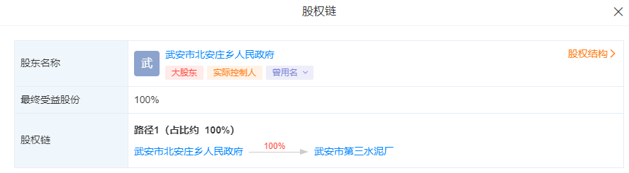 據(jù)查詢:武安市第三水泥廠,法定代表人張海平,工商注冊地址位于河北省邯鄲市武安市北安莊鄉(xiāng)同會村。股權(quán)鏈顯示,企業(yè)為武安市北安莊鄉(xiāng)人民政府100%控股企業(yè)。