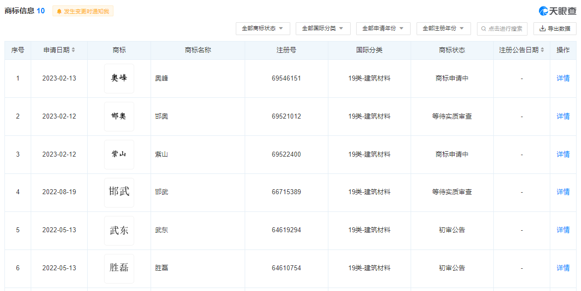 旗下共有14條商標信息,其中2023年2月15日申請的“名鼎太行山”商標目前狀態(tài)為“商標申請”。“金隅太行山”未查到。