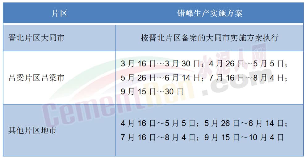 《山西省水泥行業(yè)2023-2024年錯峰生產(chǎn)工作實施方案》要求所有水泥熟料生產(chǎn)線非采暖錯峰生產(chǎn)次數(shù)不少于三次;其中完成超低排放改造的企業(yè)不少于60天,未完成超低排放改造的企業(yè)不少于70天。