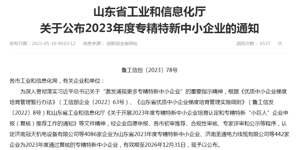 5月10日,山東省工業(yè)和信息化廳發(fā)布“2023年度專精特新中小企業(yè)”通知名單,山東永正產(chǎn)業(yè)技術研究院憑借自身實力和專業(yè)技術,通過層層專業(yè)評審榮登榜單。