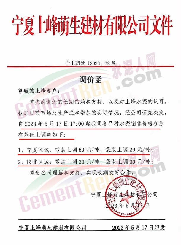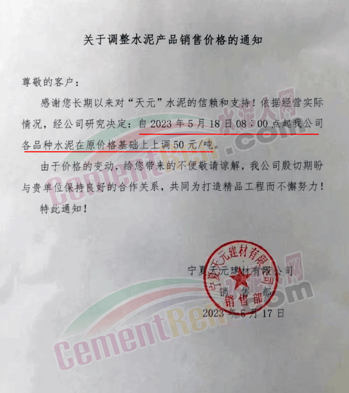 寧夏瀛海天琛建材有限公司通知,根據(jù)公司實(shí)際經(jīng)營(yíng)情況,現(xiàn)決定,自2023年5月17日零點(diǎn)起,各品種水泥在原價(jià)格基礎(chǔ)上上調(diào)50元/噸。