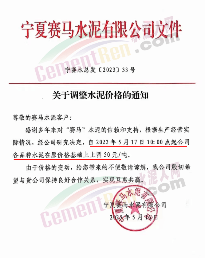 寧夏賽馬水泥有限公司通知,根據(jù)生產(chǎn)經(jīng)營(yíng)實(shí)際情況,經(jīng)公司研究決定,自2023年5月17日10時(shí)起公司各品種水泥在原價(jià)格基礎(chǔ)上上調(diào)50元/噸。
