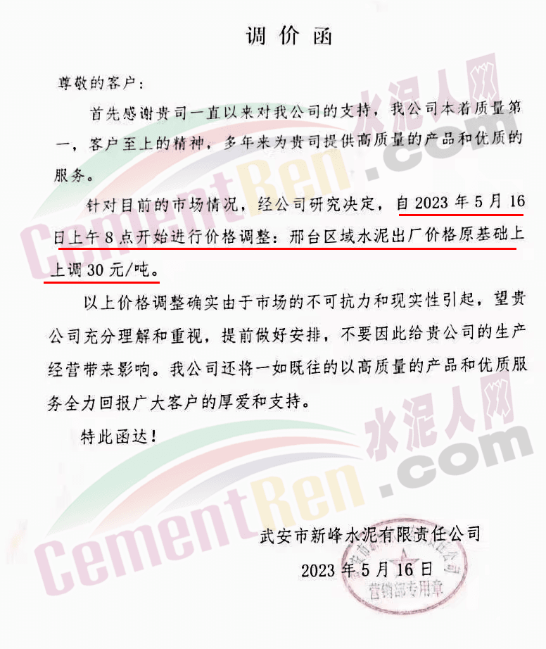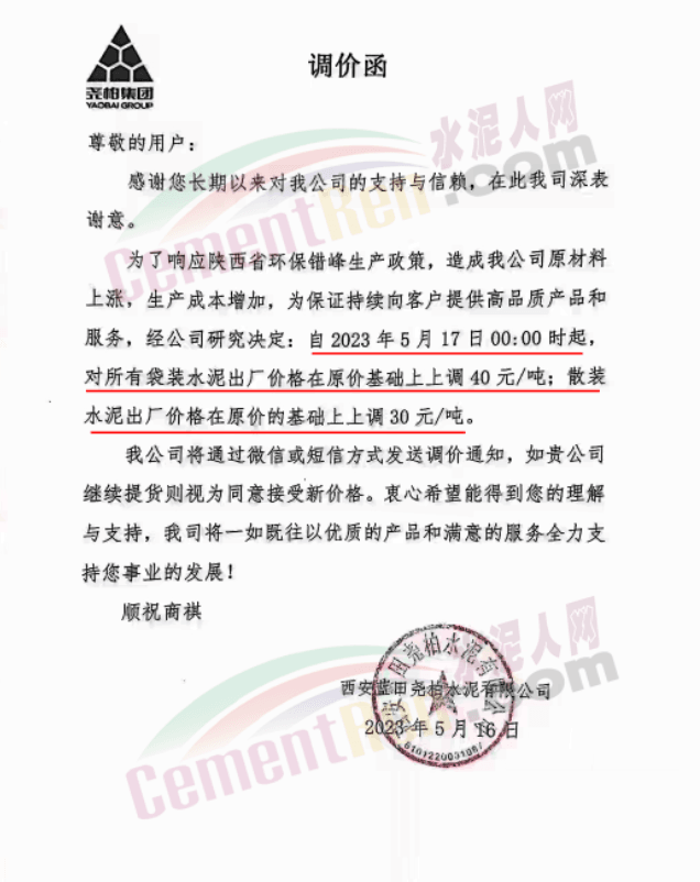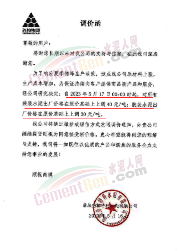 同日,蒲城堯柏特種水泥有限公司通知,為了響應(yīng)夏季錯(cuò)峰生產(chǎn)政策,造成公司原材料上漲,生產(chǎn)成本增加,為保證持續(xù)向客戶提供高品質(zhì)產(chǎn)品和服務(wù)。經(jīng)公司研究決定:自5月17日0時(shí)起,對(duì)所有袋裝水泥出廠價(jià)格在原價(jià)基礎(chǔ)上上調(diào)40元/噸;散裝水泥出廠價(jià)格在原價(jià)基礎(chǔ)上上調(diào)30元/噸。