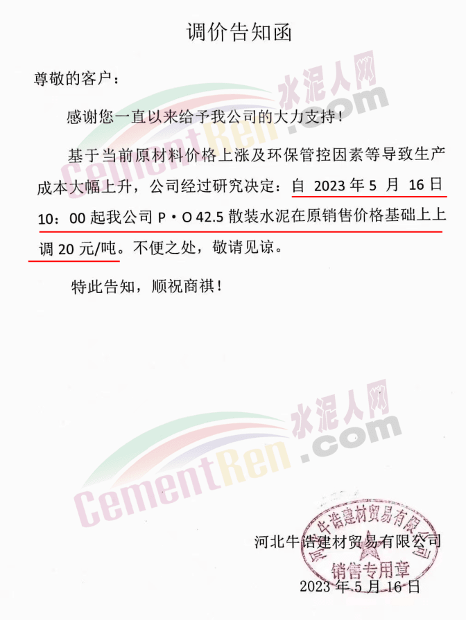 河北牛誥建材貿(mào)易有限公司通知,基于當(dāng)前原材料價(jià)格上漲及環(huán)保管控因素等導(dǎo)致生產(chǎn)成本大幅上升,公司經(jīng)過(guò)研究決定:自5月16日10時(shí)起,P.O42.5散裝水泥上調(diào)20元/噸。