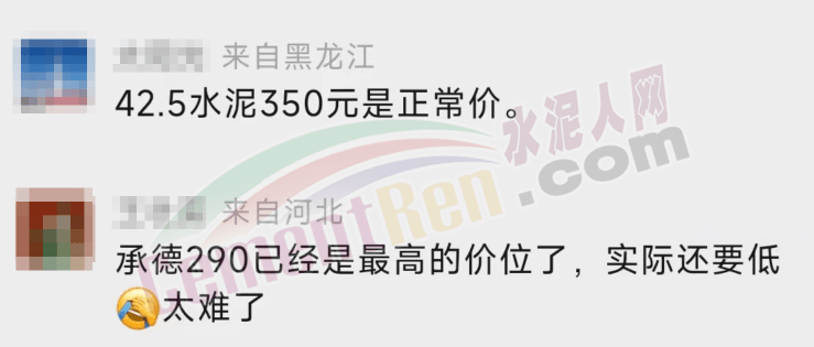來(lái)自黑龍江的網(wǎng)友表示,42.5水泥350元/噸是正常價(jià);來(lái)自河北的網(wǎng)友表示,承德P.O42.5水泥290元/噸是最高的價(jià)位了,實(shí)際還要低。