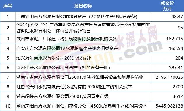 10個已成交項目中,除廣西賓陽縣昆侖資產(chǎn)投資發(fā)展有限責(zé)任公司持有的黎塘暨陽水泥有限公司債權(quán)公開轉(zhuǎn)讓及紹興萬年青水泥有限公司20%股權(quán)轉(zhuǎn)讓外,其他均為機(jī)器設(shè)備或生產(chǎn)線閑置資產(chǎn)。且主要為中國建材集團(tuán)旗下南方水泥、天山水泥、中聯(lián)水泥等企業(yè)閑置資產(chǎn)。
