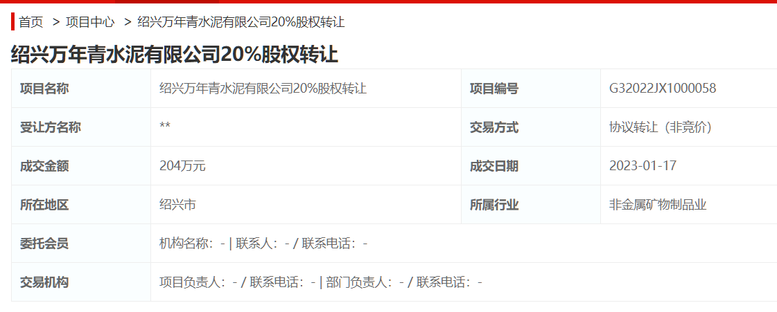 水泥人網(wǎng)注意到紹興萬年青水泥有限公司20%股權(quán)轉(zhuǎn)讓項目是以協(xié)議轉(zhuǎn)讓(非競價)方式成交,成交金額204萬。