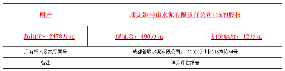 3月29日,成都市雙流區(qū)人民法院發(fā)布拍賣公告(川0116執(zhí)恢64號)提到定于5月4日10時至5月5日10時在京東網(wǎng)司法拍賣網(wǎng)絡(luò)平臺公開拍賣涉案財產(chǎn)。拍賣財產(chǎn)為康定跑馬山水泥有限責(zé)任公司12%的股權(quán),起拍價2478萬元。