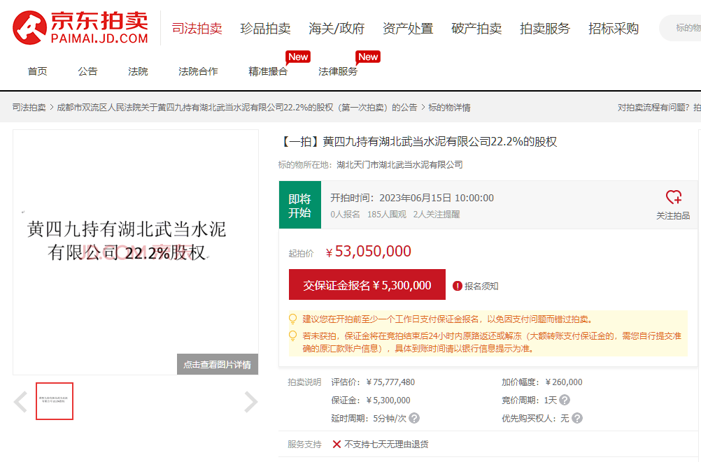 京東資產(chǎn)交易平臺另有信息顯示,黃四九持有的湖北武當(dāng)水泥有限公司18%、22.2%的股權(quán)也即將拍賣,起拍價分別為4301萬元、5305萬元。湖北武當(dāng)水泥有限公司成立于2006年,位于湖北省十堰市鄖西縣城關(guān)鎮(zhèn),該公司擁有一座2500t/d全能工廠。湖北武當(dāng)水泥有限公司由黃四九持股99%。