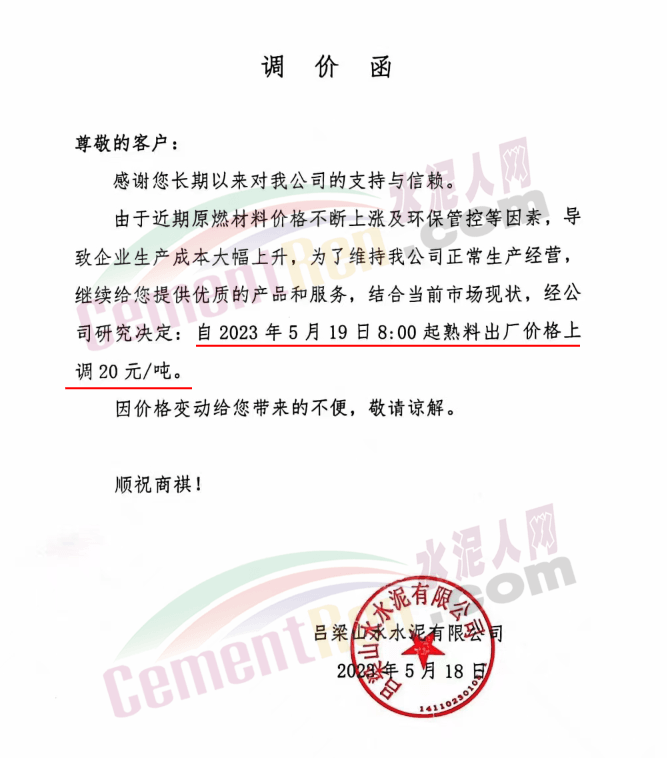山西晉興奧隆建材有限責任公司銷售公司通知,因近期原材料價格持續(xù)上漲、環(huán)保投入加大、能耗雙控及錯峰生產等因素,造成公司生產成本增加。根據(jù)當前的市場情況,公司自2023年5月19日零時起將熟料價格在現(xiàn)行價格基礎上上調30元/噸。