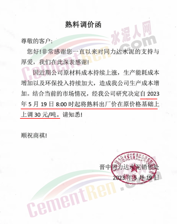 晉中同力達水泥銷售處通知,因近期公司原材料成本持續(xù)上漲,生產能耗成本增加以及環(huán)保投入持續(xù)加大,造成公司生產成本增加。結合當前的市場情況,經公司研究決定自5月19日8時起將熟料出廠價在原價格基礎上上調30元/噸。