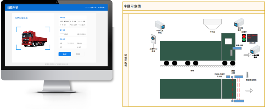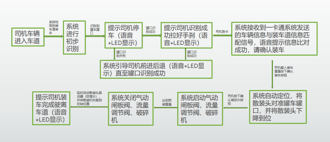 司機(jī)刷碼上磅時(shí),控制系統(tǒng)會(huì)根據(jù)庫下面的光幕、紅外傳感器等設(shè)備檢測到車輛停的位置,并通過LED顯示屏及語音自動(dòng)提示車輛停到指定的位置。當(dāng)車輛到達(dá)指定位置,司機(jī)準(zhǔn)備好可以裝車,系統(tǒng)自動(dòng)測量車輛長度、高度,測量車廂長度、高度,獲取輪軸數(shù)據(jù)(車輛荷載噸位數(shù))、車牌信息,記錄完成,卸料口開始裝車,當(dāng)物料達(dá)到車廂高度時(shí)移動(dòng)小車帶動(dòng)皮帶機(jī)及散裝機(jī)水平移動(dòng)裝車,直至裝滿整個(gè)車廂。如果未能停到指定位置,LED及語音進(jìn)行反復(fù)提示并在設(shè)定的時(shí)間后通知管理人員。