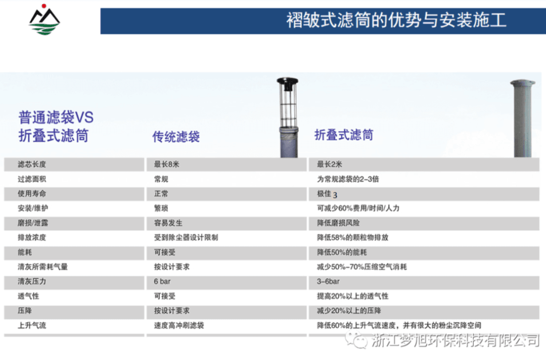 經(jīng)多家水泥企業(yè)使用證明,與傳統(tǒng)的普通濾袋相比,夢旭環(huán)保的褶皺式濾筒具有以下優(yōu)勢: