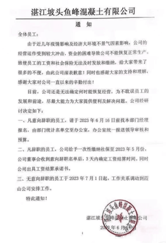 日前,廣東湛江坡頭魚峰混凝土有限公司發(fā)通知給員工稱,由于近幾年疫情影響及經(jīng)濟(jì)大環(huán)境不景氣因素影響,公司的經(jīng)營(yíng)運(yùn)作受到較大沖擊,資金的困難導(dǎo)致公司不能恢復(fù)正常生產(chǎn),致使員工的工資和社會(huì)保險(xiǎn)無法及時(shí)發(fā)放和繳納。目前,公司無法確定何時(shí)能恢復(fù)經(jīng)營(yíng),為不耽誤員工的發(fā)展和前途,為員工提供了離職與調(diào)動(dòng)方案。
