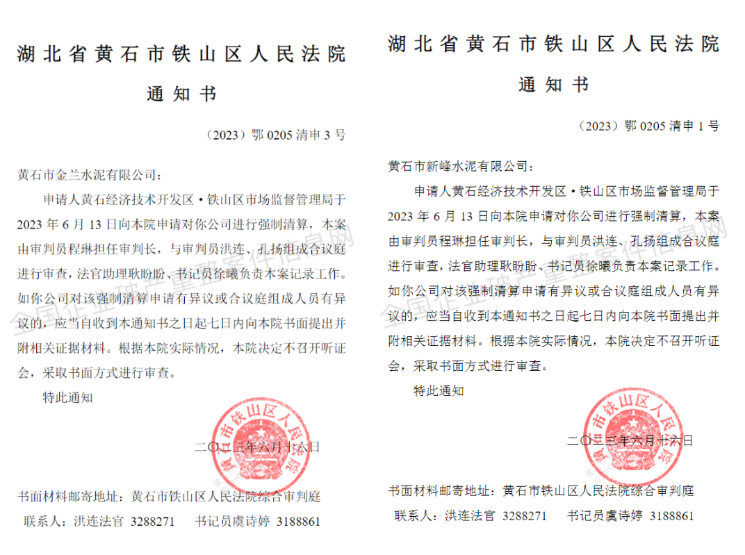 據(jù)全國(guó)企業(yè)破產(chǎn)重整案件信息網(wǎng)消息,近日,湖北黃石經(jīng)濟(jì)技術(shù)開發(fā)區(qū)·鐵山區(qū)市場(chǎng)監(jiān)督管理局于2023年6月13日向法院申請(qǐng)對(duì)黃石市金蘭水泥有限公司、黃石市新峰水泥有限公司兩家企業(yè)進(jìn)行強(qiáng)制清算。