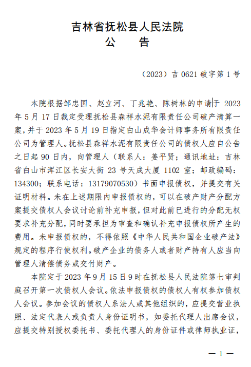 吉林省撫松縣人民法院公告于2023年5月17日裁定受理撫松縣森祥水泥有限責(zé)任公司破產(chǎn)清算一案,并于2023年5月19日指定白山成華會(huì)計(jì)師事務(wù)所有限責(zé)任公司為管理人。