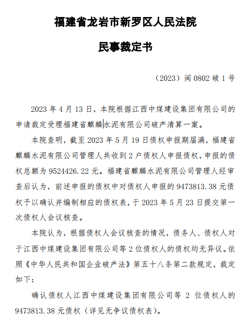 2023年4月13日,福建省龍巖市新羅區(qū)人民法院根據(jù)江西中煤建設(shè)集團(tuán)有限公司的申請(qǐng)裁定受理福建省麒麟水泥有限公司破產(chǎn)清算一案。法院查明,截至2023年5月19日債權(quán)申報(bào)期屆滿,福建省麒麟水泥有限公司管理人共收到2戶債權(quán)人申報(bào)債權(quán),申報(bào)的債權(quán)總額為9524426.22元。