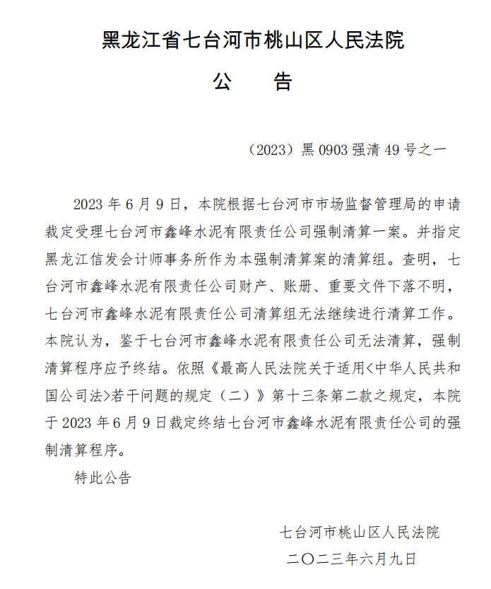 七臺(tái)河市鑫峰水泥有限責(zé)任公司強(qiáng)制清算