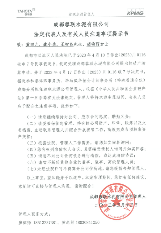 成都市雙流區(qū)人民法院于2023年4月10日裁定受理成都蓉聯(lián)水泥有限公司提出的破產(chǎn)清算申請(qǐng),并于2023年4月17日指定泰和泰律師事務(wù)所、畢馬威華振會(huì)計(jì)師事務(wù)所特殊普通合伙成都分所擔(dān)任蓉聯(lián)水泥公司管理人。