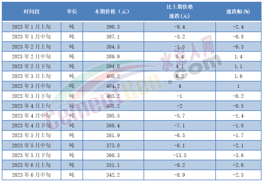 廣西區(qū)域某品牌企業(yè)銷售負責人表示:淡季市場“全國統(tǒng)一”行情。從國家統(tǒng)計局近日發(fā)布的2023年6月中旬流通領(lǐng)域水泥市場價格變動情況可見,雖煤炭價格出現(xiàn)小幅回升,但水泥價格仍持續(xù)下跌,P.O42.5散裝水泥較6月上旬下跌8.9元/噸,又一次刷新近五年來的價格最低點。