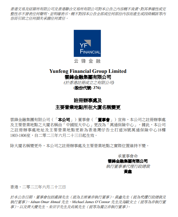 6月23日,云鋒金融集團發(fā)布公告,公司之注冊辦事處及主要營業(yè)地點之大廈名稱由“中國恒大中心”更改為“萬通保險中心”。據(jù)此,公司之注冊辦事處地址及主要營業(yè)地點更新為香港灣仔告士打道38號萬通保險中心18樓1803-1806室,自2023年6月23日起生效。