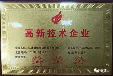近日,江蘇碧博士紡織品有限公司(以下簡稱“碧博士”)成功獲得國家“高新技術(shù)企業(yè)”認(rèn)定殊榮,正式邁入國家高新技術(shù)企業(yè)行列。本次成功入選高新技術(shù)企業(yè),是國家相關(guān)部門對碧博士多年來工作的肯定,也是碧博士產(chǎn)品研發(fā)實(shí)力與創(chuàng)新能力的體現(xiàn)。
