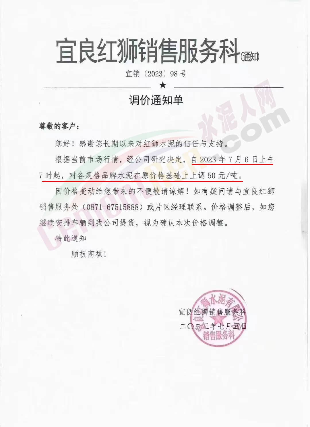 宜良紅獅銷售服務(wù)科通知,根據(jù)當(dāng)前市場行情,經(jīng)公司研究決定,自2023年7月6日上午7時(shí)起,對各規(guī)格品牌水泥在原價(jià)格基礎(chǔ)上上調(diào)50元/噸。