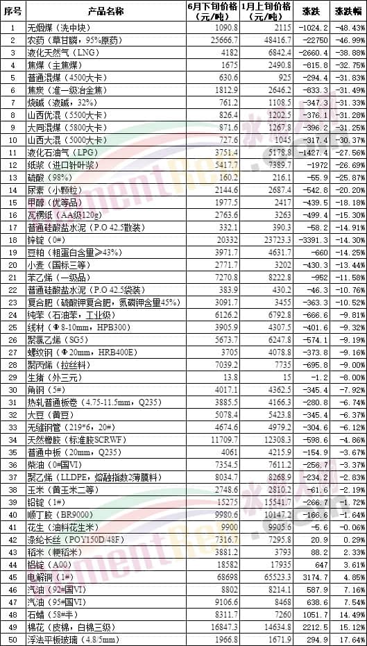 環(huán)比5月下旬,50種生產(chǎn)物資中有30種下跌,其中包含煤炭、液化石油氣、水泥、柴油及多種化工品,另外柴油、汽油價格也處于下跌列表中。