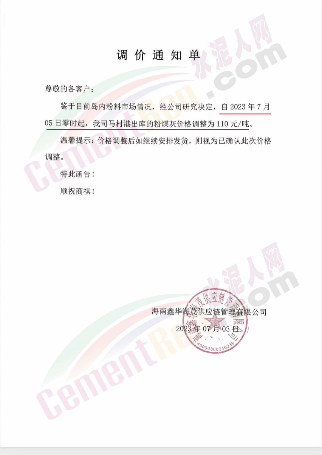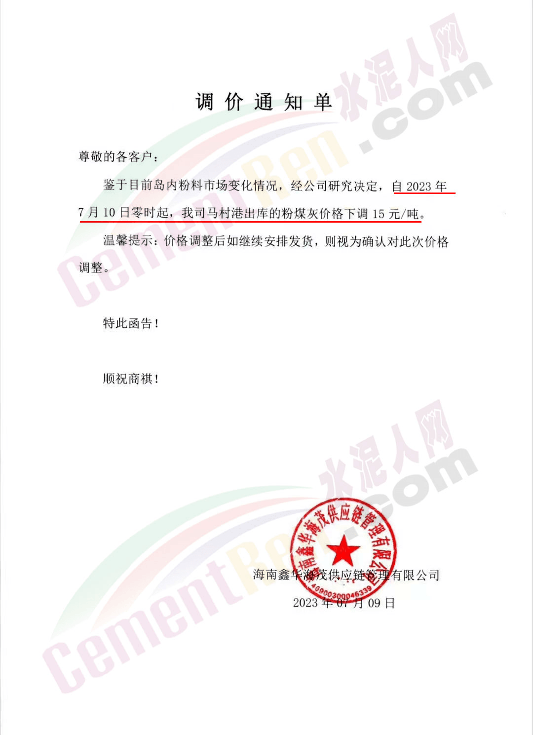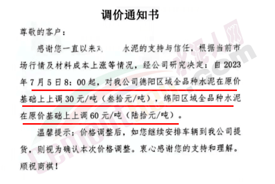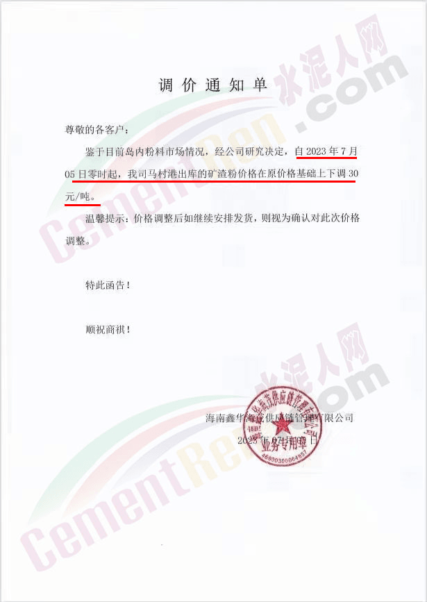 “天涯‘牌水泥通知,自2023年7月8日零時起所有品種水泥在出廠價格基礎(chǔ)上上調(diào)30元/噸,同期調(diào)整粉煤灰及礦渣粉報價。