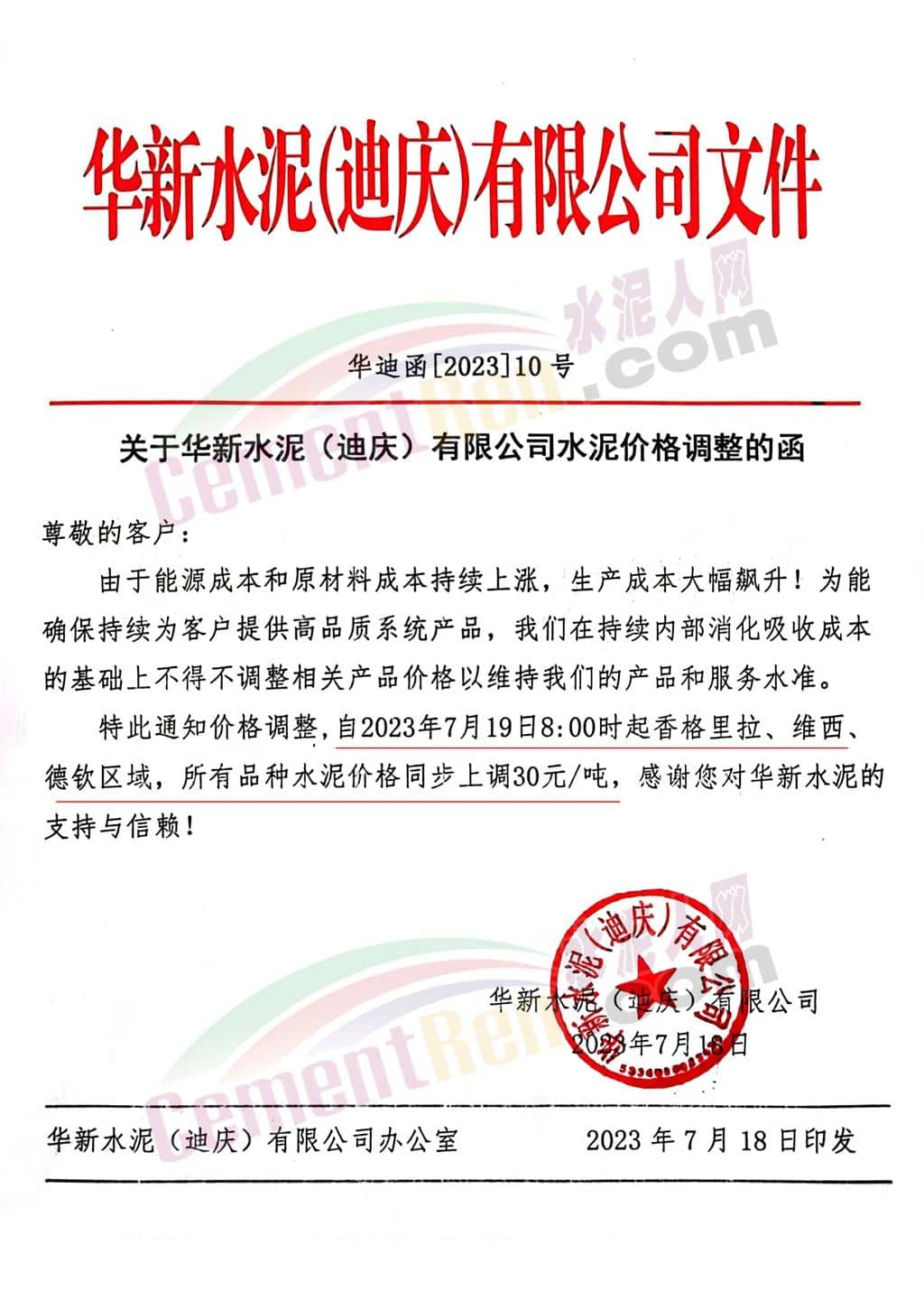 華潤水泥華西大區(qū)市場部通知受原材料價格上漲影響,為保障持續(xù)為客戶提供優(yōu)質(zhì)的產(chǎn)品和服務,經(jīng)公司研究決定,自2023年7月18日0時起,從華潤水泥(鶴慶)有限公司出貨至麗江、大理地區(qū)市場的所有品種水泥出廠價上調(diào)30元/噸。