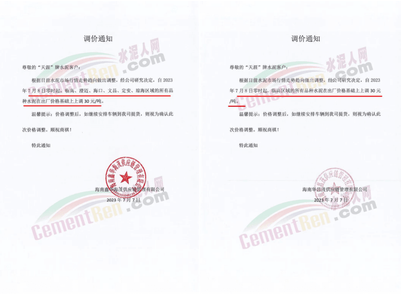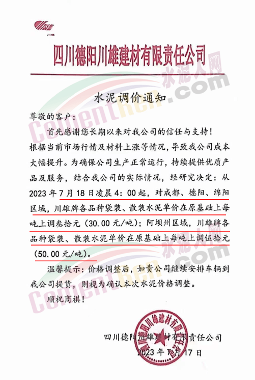 迪慶香格里拉昆鋼鴻達水泥有限公司通知鑒于目前原燃材料價格上漲因素影響,為保障正常市場供應,經(jīng)公司研究決定作出以下價格調(diào)整,對銷售迪慶區(qū)域全品種水泥在原出廠單價基礎(chǔ)上統(tǒng)一上調(diào)30元/噸,執(zhí)行時間2023年7月18日0時。