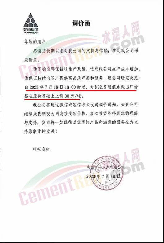 蒲城堯柏特種水泥有限公司通知,為了響應環(huán)保錯峰生產(chǎn)政策,造成公司生產(chǎn)成本增加。為保證持續(xù)向客戶提供高品質(zhì)產(chǎn)品和服務,經(jīng)公司研究決定,自2023年7月18日18時起,對M32.5袋裝水泥出廠價格在原價基礎(chǔ)上上調(diào)30元/噸。