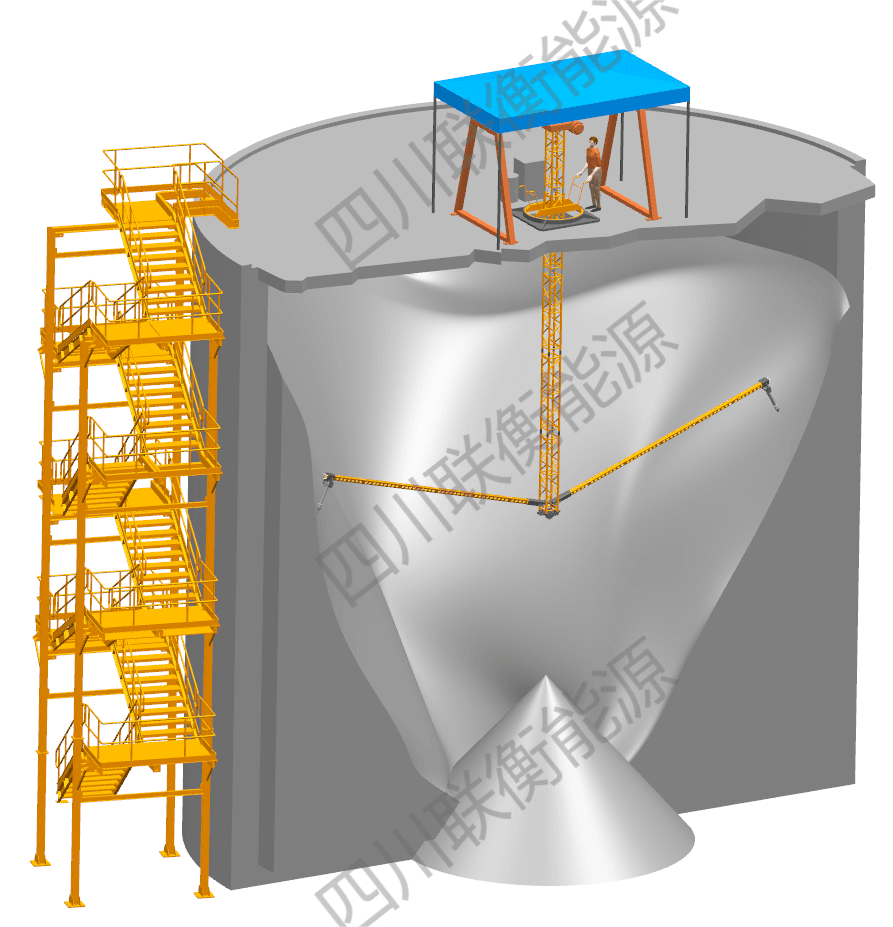 高比強(qiáng)度材料和機(jī)械臂構(gòu)型設(shè)計(jì),解決了設(shè)備自重和大空間部署的矛盾。只需在水泥庫頂近中央部3米范圍內(nèi)開孔1米,即可安裝設(shè)備入庫清理。模組化機(jī)械臂可適應(yīng)各尺寸水泥庫。