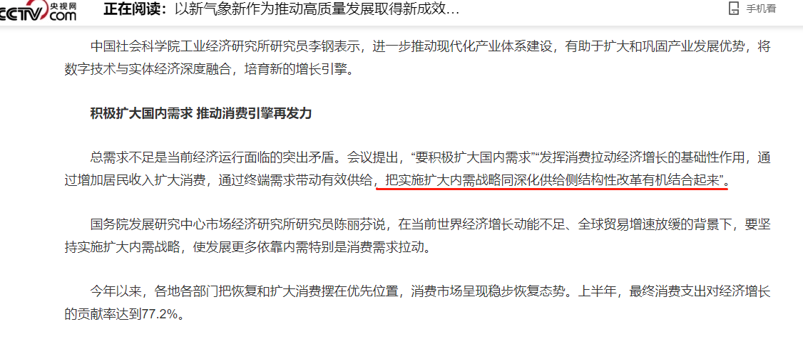 近日,國(guó)家下半年經(jīng)濟(jì)會(huì)議召開(kāi),針對(duì)國(guó)內(nèi)經(jīng)濟(jì)疲軟,給出救市方案,會(huì)議強(qiáng)調(diào),要積極擴(kuò)大國(guó)內(nèi)需求,發(fā)揮消費(fèi)拉動(dòng)經(jīng)濟(jì)增長(zhǎng)的基礎(chǔ)性作用,通過(guò)增加居民收入擴(kuò)大消費(fèi),通過(guò)終端需求帶動(dòng)有效供給,把實(shí)施擴(kuò)大內(nèi)需戰(zhàn)略同深化供給側(cè)結(jié)構(gòu)性改革有機(jī)結(jié)合起來(lái)。