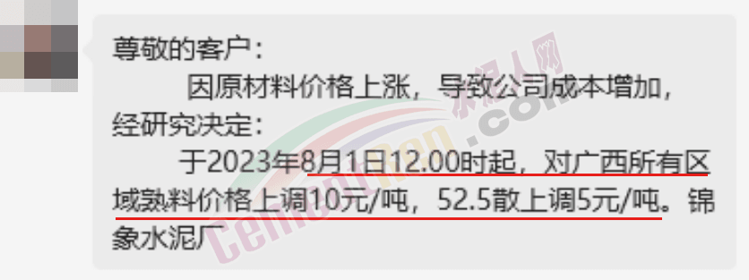 水泥人網(wǎng)消息:日前,廣西錦象水泥通知,因原材料價格上漲,導(dǎo)致公司成本增加,經(jīng)研究決定:于2023年8月1日12時起,對廣西所有區(qū)域熟料價格上調(diào)10元/噸,52.5散上調(diào)5元/噸。