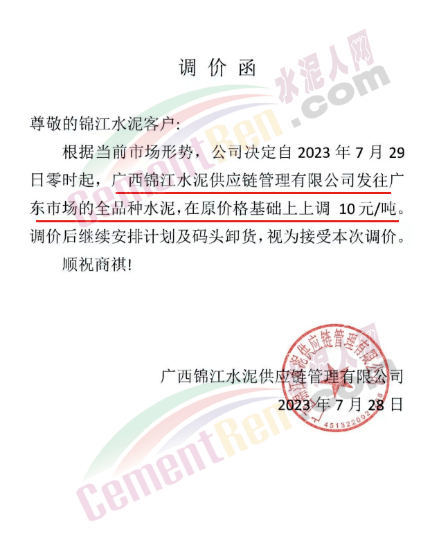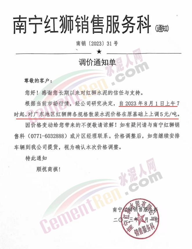 同期,南寧紅獅銷售服務(wù)科通知,根據(jù)當前市場行情,經(jīng)公司研究決定,自2023年8月1日上午7時起,對廣東地區(qū)紅獅牌各規(guī)格散裝水泥價格在原基礎(chǔ)上上調(diào)5元/噸。